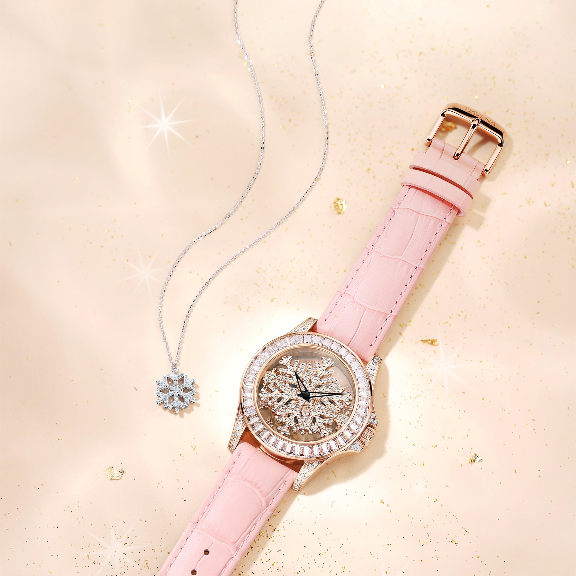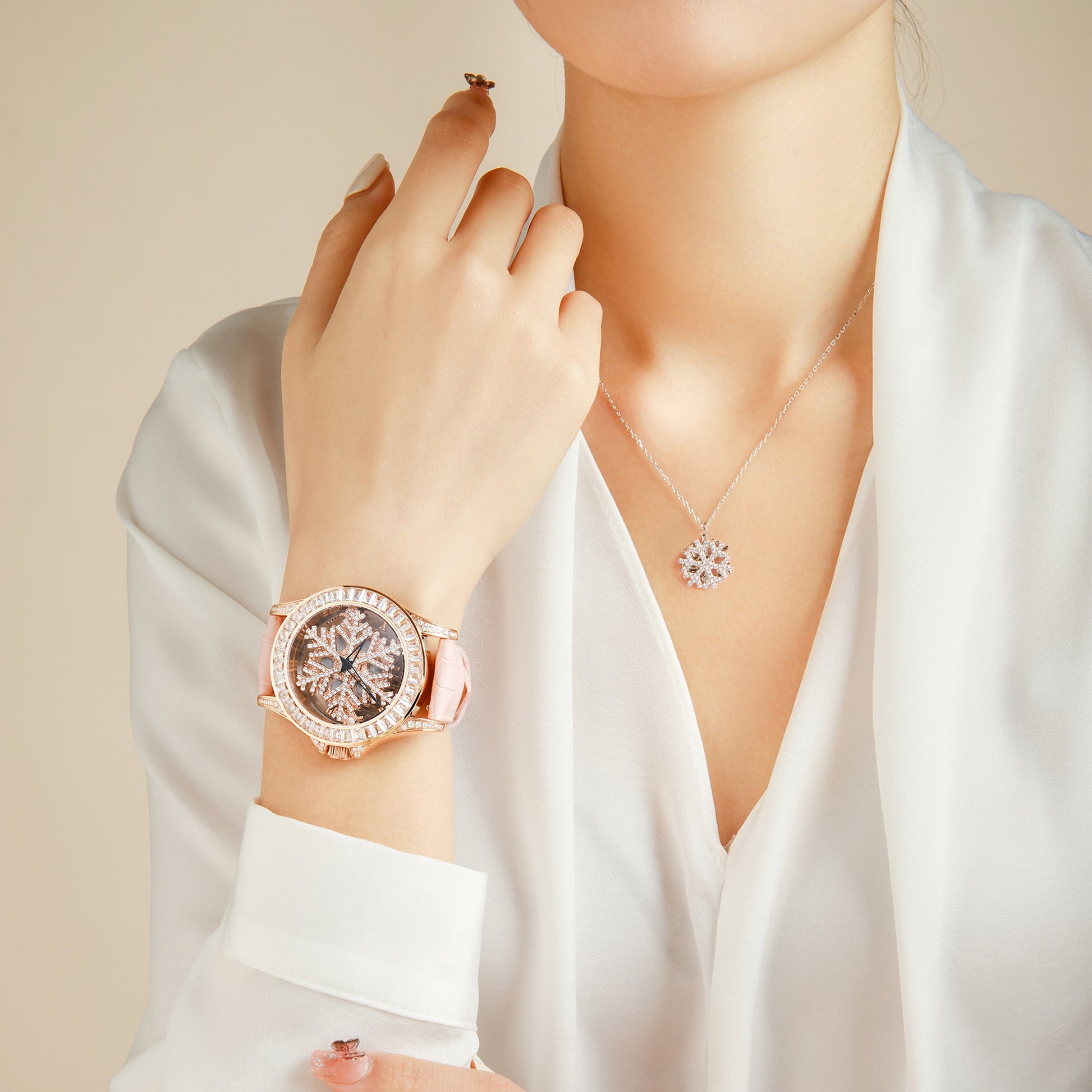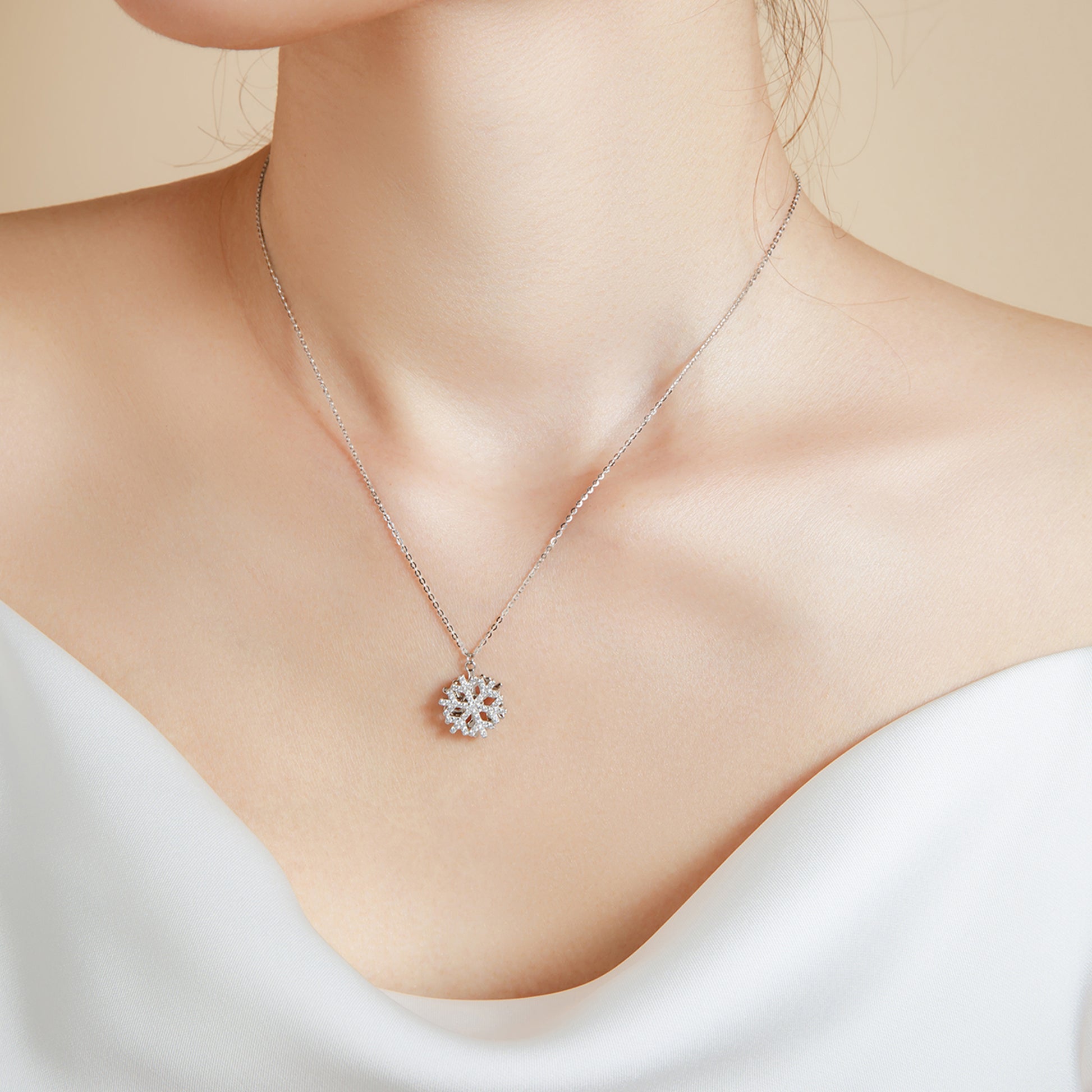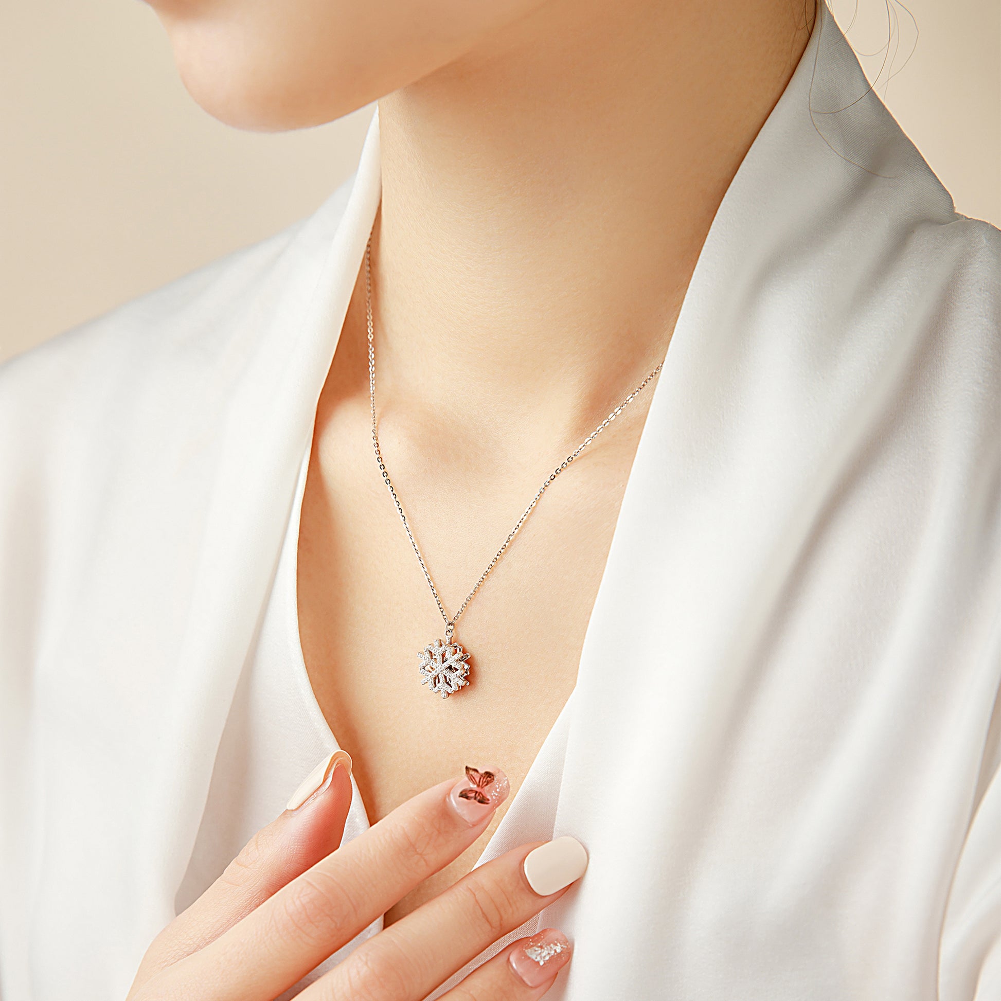 Inspired by the delicate beauty of a snowflake, this piece features a unique rotating design that sparkles with every movement. Its intricate craftsmanship captures the endless magic of romance and the fleeting elegance of nature. Wearing it brings a sense of timeless charm, allowing you to carry a touch of winter’s wonder and everlasting love wherever you go.